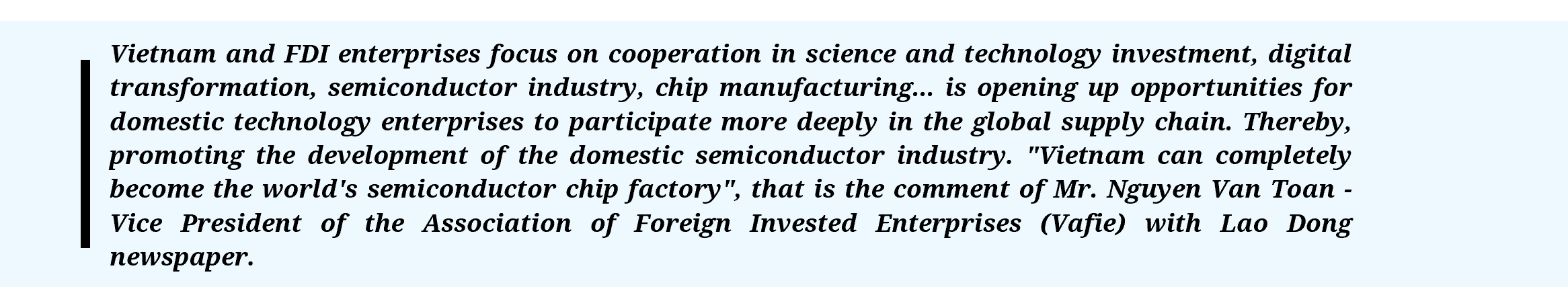 There is an issue that FDI enterprises are very interested in, which is electricity. Each semiconductor chip factory needs about 100 MW of electricity, equivalent to an average power plant. In particular, the power source must be clean, renewable energy, not traditional, fossil energy. We must solve all these problems to become the world’s semiconductor chip manufacturing center.