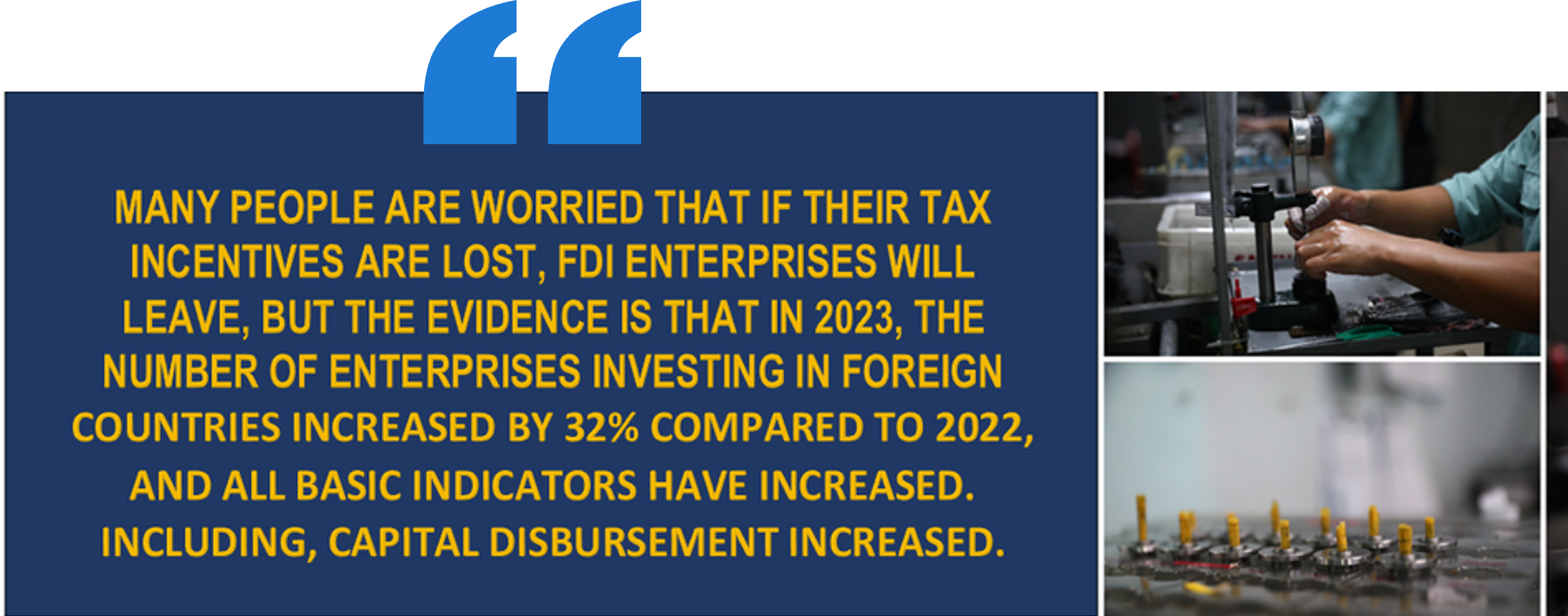 When Vietnam applies the Global Minimum Tax, FDI enterprises investing in Vietnam will no longer receive tax incentives, the tax rate will increase to 15% from 2024. Many people are concerned that if tax incentives are lost, FDI enterprises will leave, but the evidence is that in 2023, the number of foreign-invested enterprises in Vietnam increased by 32% compared to 2022, the basic indicators all increased, in which, capital disbursement increased.